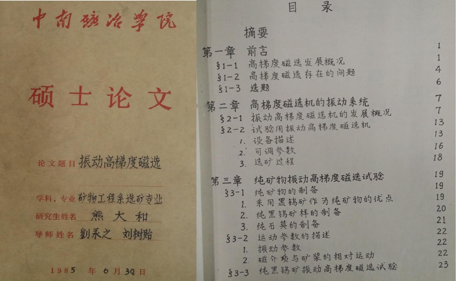 1982年-1988年,公司创始人熊大和博士在中南矿冶院(先后更名为中南工业大学、中南大学)开始了硕士研究生和博士研究生生涯,并着手开始磁选技术的学习与研究。1985年6月,以《振动高梯度磁选》硕士研究论文毕业于中南矿冶学院(现中南大学)矿物工程系选矿专业,获得硕士学位。论文以高梯度磁选技术为基础,在此基础上研究设计了振动高梯度磁选系统和相关的选矿应用研究,开展了立环脉动高梯度磁选技术的基础理论研究。
