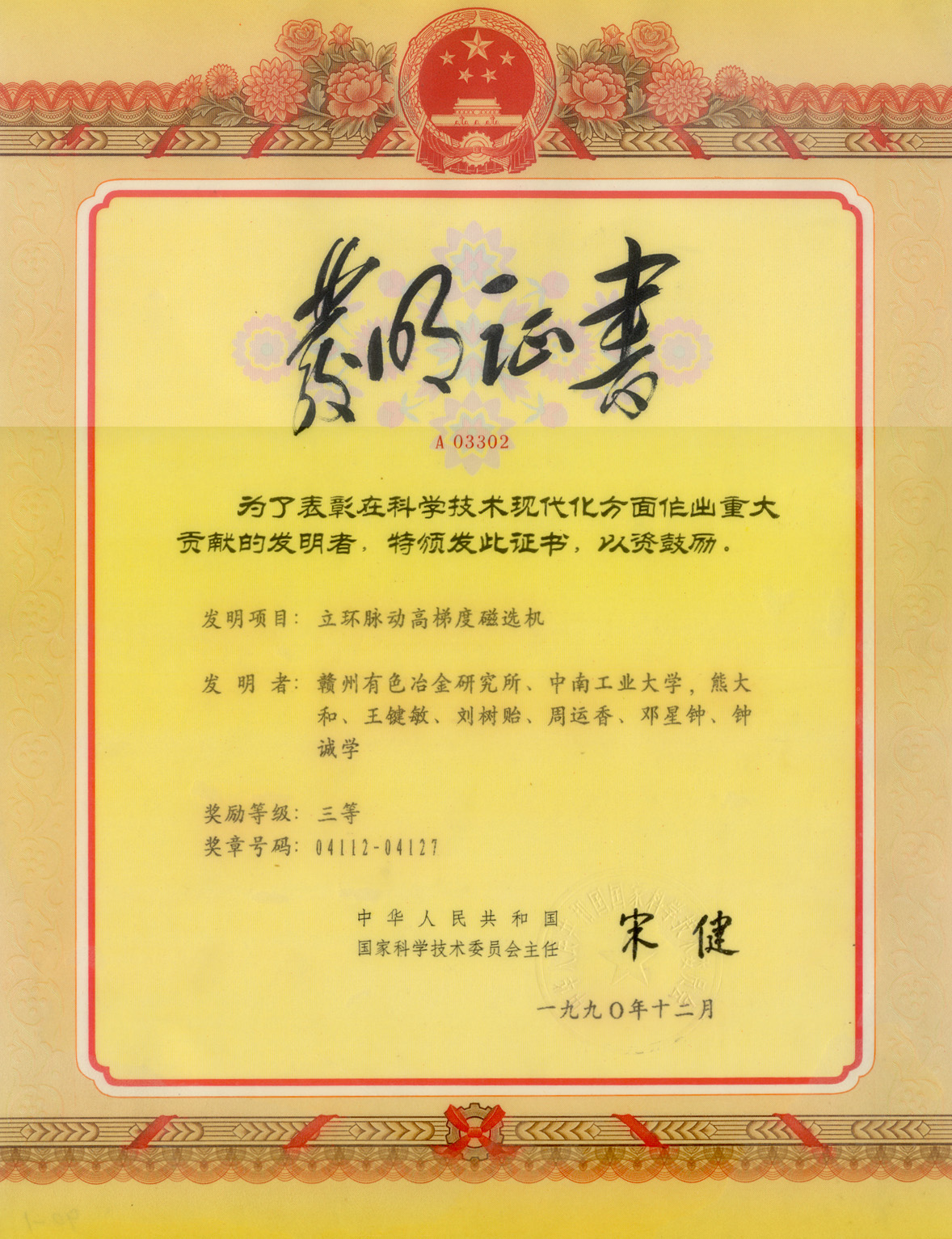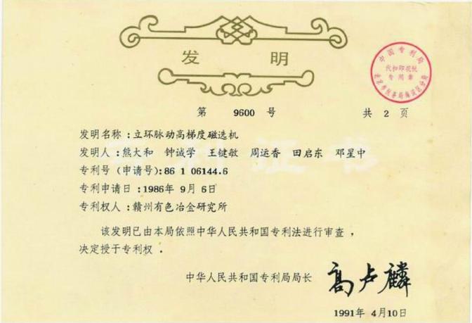 在此期间,立环脉动高梯度磁选技术以其先进的技术性能和优秀的工业化应用指标,屡获殊荣:1990年荣获国家科学技术发明三等奖、1995年荣获江西省科技进步奖一等奖和国家科学技术三等奖,1996年2台SLon立环脉动高梯度磁选机出口南非,开创了我国电磁产品出口的先河。高梯度磁选技术开始在马钢、宝钢、鞍钢等国内重点铁矿企业推广普及。
