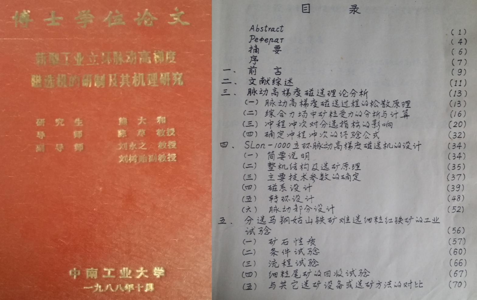 1988年10月,熊大和博士正式以《新型工业立环脉动高梯度磁选机的研制及其机理研究》博士研究论文毕业于中南工业大学(现中南大学)矿物工程系选矿专业,获得博士学位。该论文详细地介绍了立环脉动高梯度磁选技术的技术理论和创新设计。该论文的发表标志立环脉动高梯度磁选技术理论正式诞生,为立环脉动高梯度磁选技术的应用与发展奠定了坚实的基础,标志着电磁技术领域正式进入了立环高梯度磁选技术的新时代。