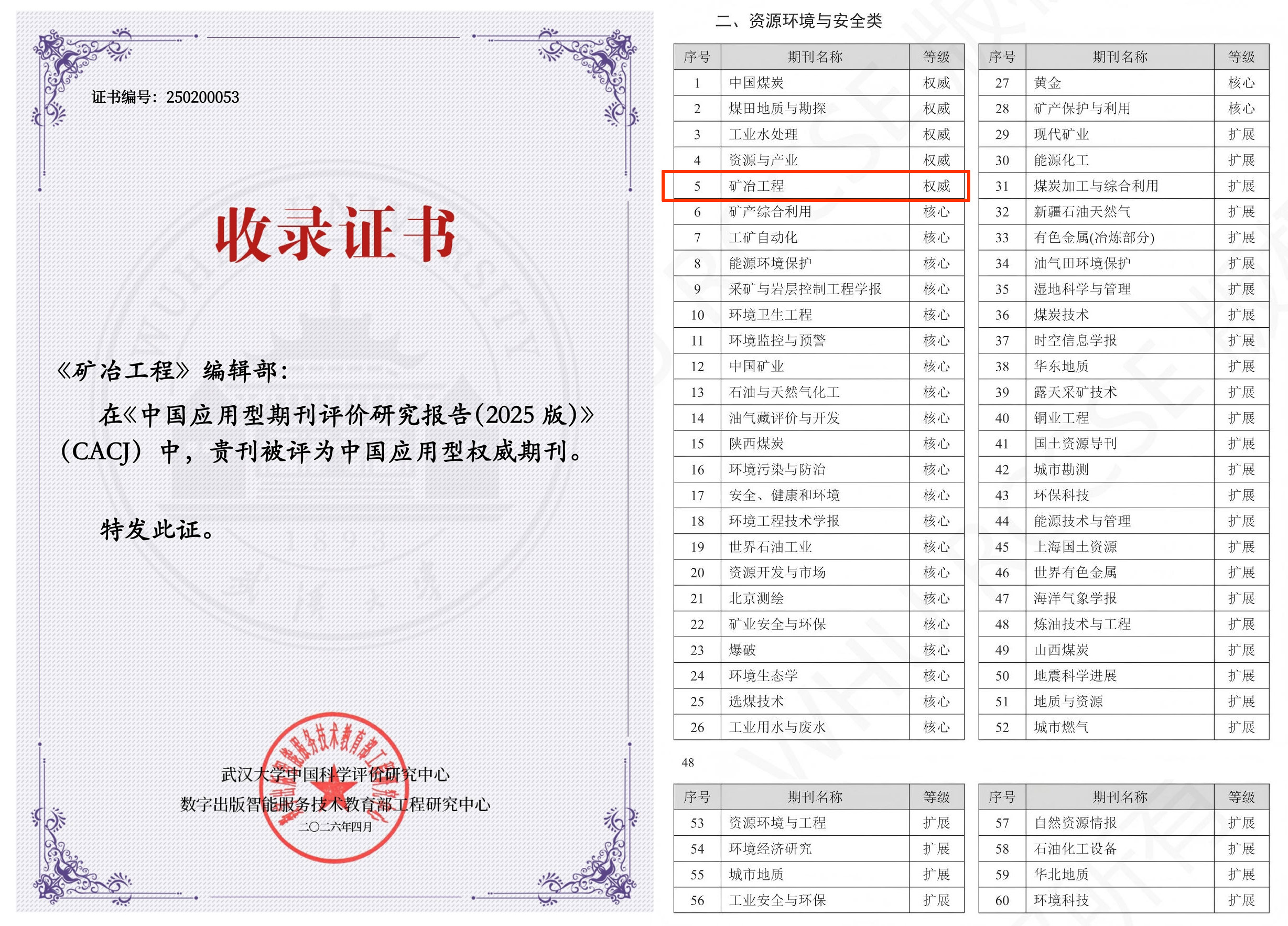 近日,由武汉大学中国科学评价研究中心、数字出版智能服务技术教育部工程研究中心联合研制的《中国应用型期刊评价研究报告(2025版)》正式发布,在资源环境与安全领域共遴选出权威期刊5种,《矿冶工程》凭借过硬的办刊质量与突出的行业贡献成功入选CACJ中国应用型权威期刊,定位为核心期刊中的核心,在特定学科领域内被广泛认可的顶尖期刊!